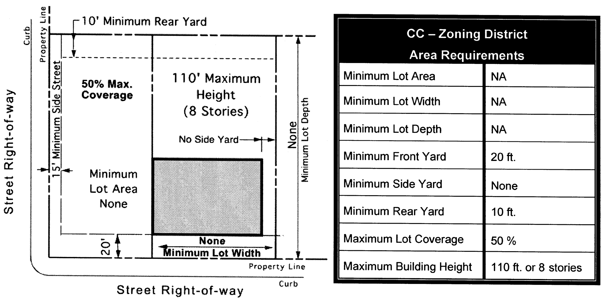 Area requirements. The requirements regulating the mimimum lot size, minimum yard size (front, side, and rear), maximum building height (stories and feet), and maximum lot coverage, and minimum floor area, as it pertains to this district, shall conform with the provisions provided in the density, area, yard, height, and lot coverage requirements for the CC zoning district.