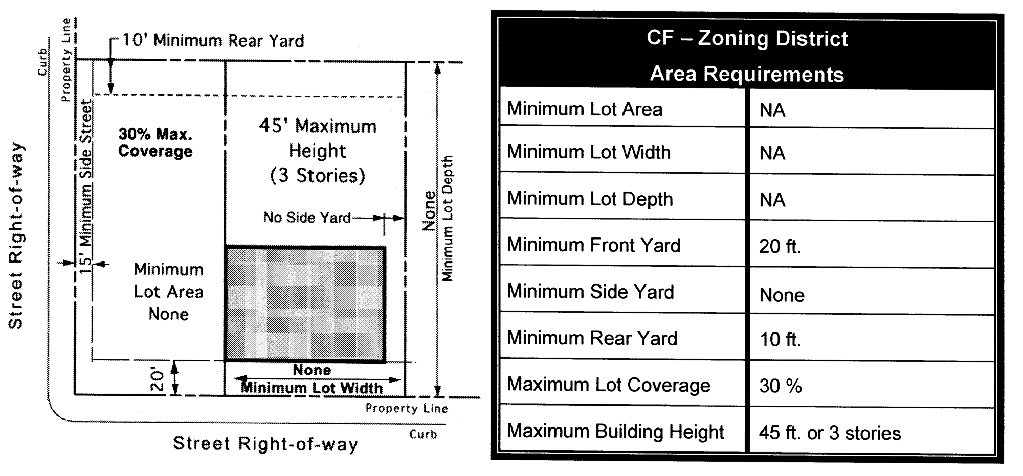 Area requirements. The requirements regulating the minimum lot size, minimum yard size (front, side, and rear), maximum building height (stories and feet), and maximum lot coverage, and minimum floor area, as it pertains to this district, shall conform with the provisions provided in the density, area, yard, height, and lot coverage requirements for the CF zoning district.