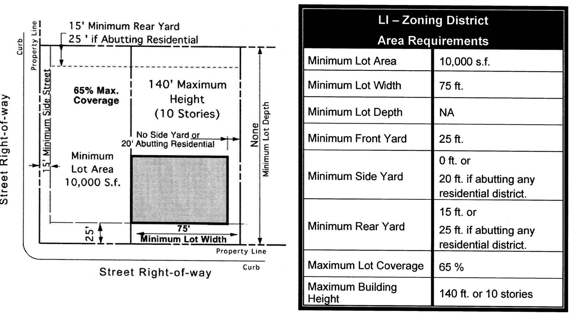 Area requirements. The requirements regulating the minimum lot size, minimum yard size (front, side, and rear), maximum building height (stories and feet), and maximum lot coverage, and minimum floor area, as it pertains to this district, shall conform with the provisions provided in the density, area, yard, height, and lot coverage requirements for the LI zoning district.