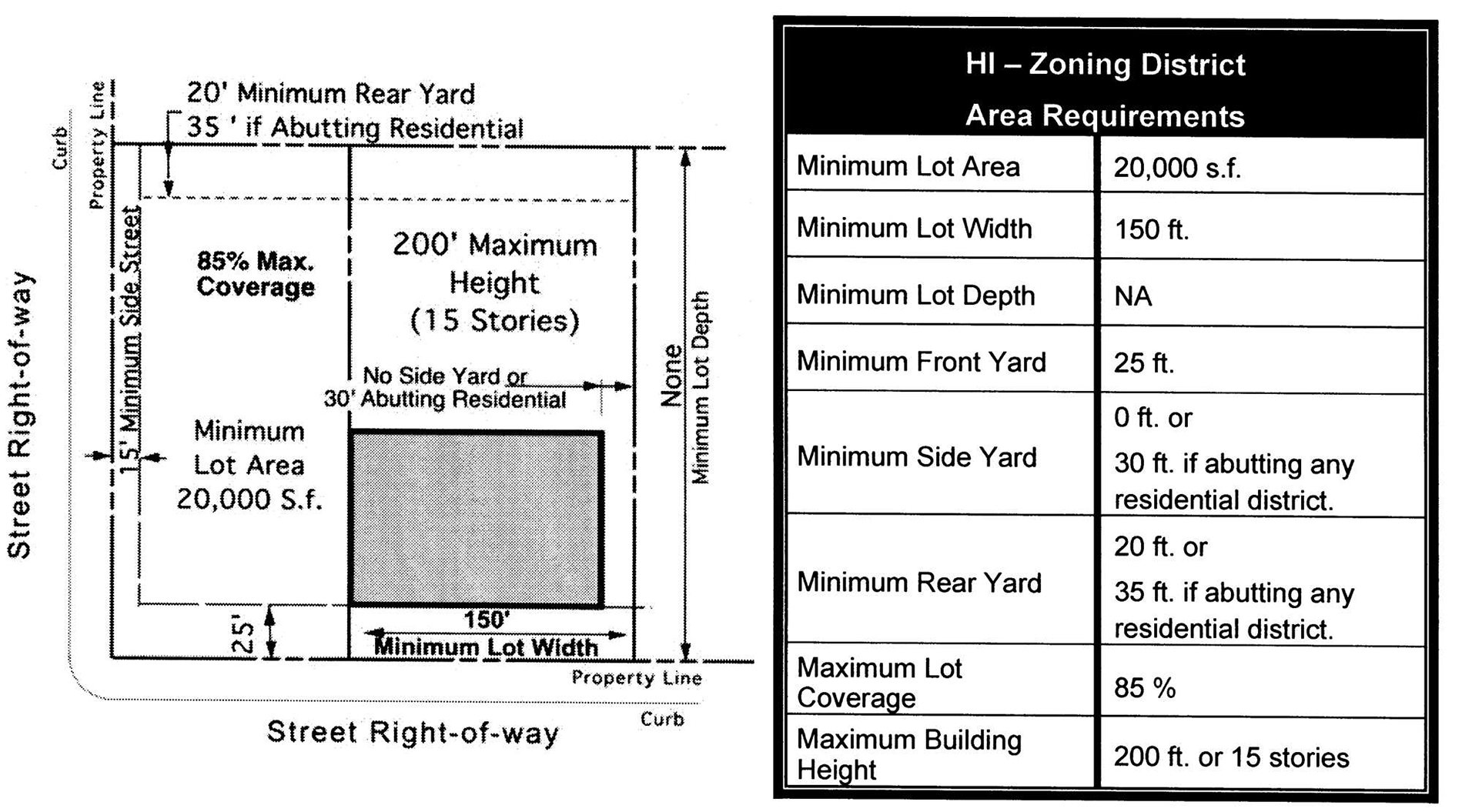 Area requirements. The requirements regulating the minimum lot size, minimum yard size (front, side, and rear), maximum building height (stories and feet), and maximum lot coverage, and minimum floor area, as it pertains to this district, shall conform with the provisions provided in the density, area, yard, height, and lot coverage requirements for the HI zoning district.