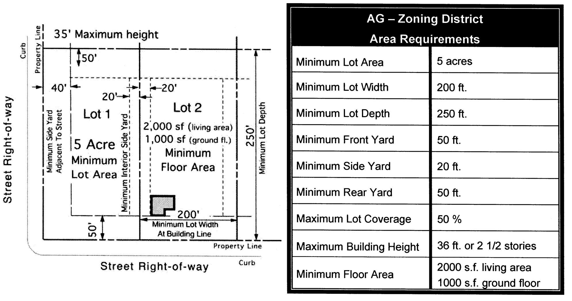 Area requirements. The requirements regulating the minimum lot size, minimum yard size (front, side, and rear), maximum building height (stories and feet), and maximum lot coverage, and minimum floor area, as it pertains to this district, shall conform with the provisions provided in the Density, Area, Yard, Height, and Lot Coverage Requirements for the AG Zoning District.
