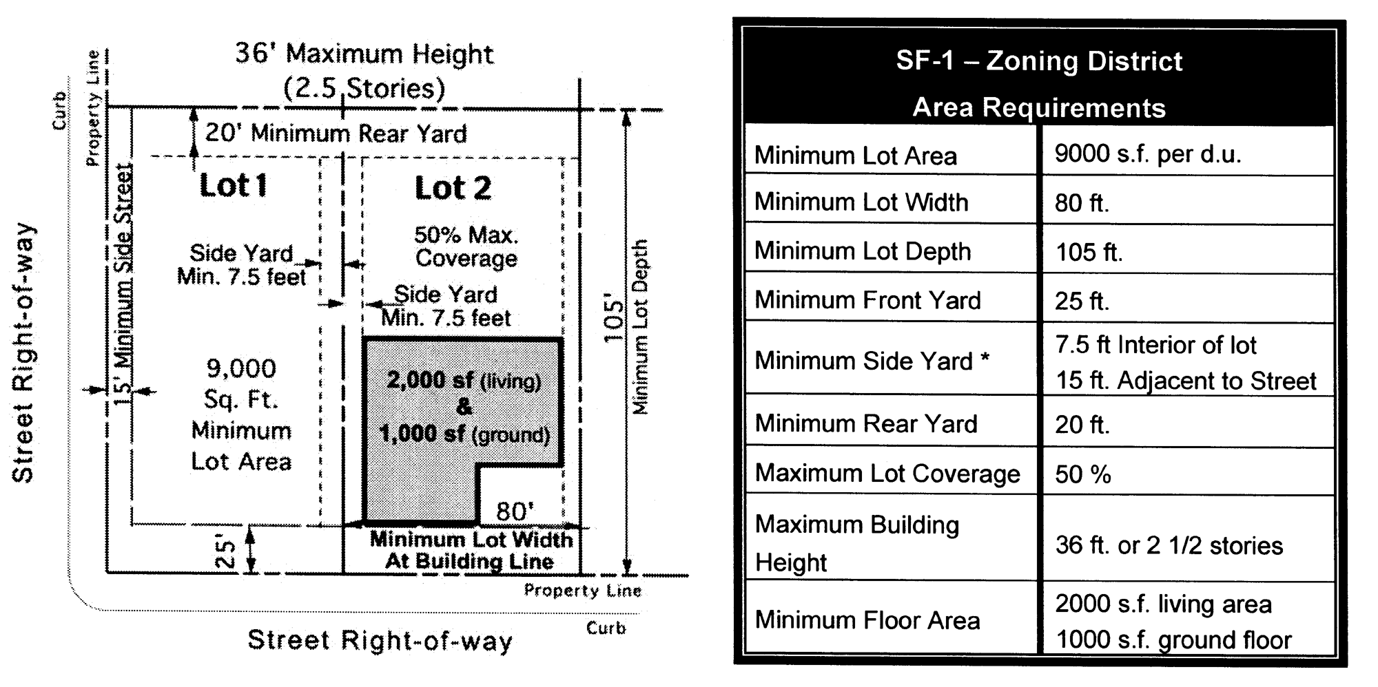 Area requirements. The requirements regulating the minimum lot size, minimum yard size (front, side, and rear), maximum building height (stories and feet), and maximum lot coverage, and minimum floor area, as it pertains to this district, shall conform with the provisions provided in the density, area, yard, height, and lot coverage requirements for the SF1 Zoning District.