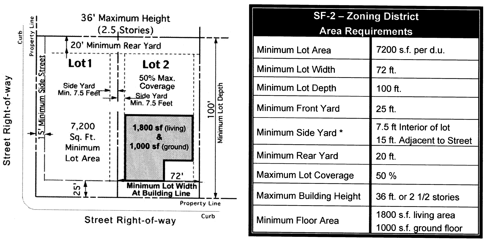 Area requirements. The requirements regulating the minimum lot size, minimum yard size (front, side, and rear), maximum building height (stories and feet), and maximum lot coverage, and minimum floor area, as it pertains to this district, shall conform with the provisions provided in the density, area, yard, height, and lot coverage requirements for the SF2 Zoning District.