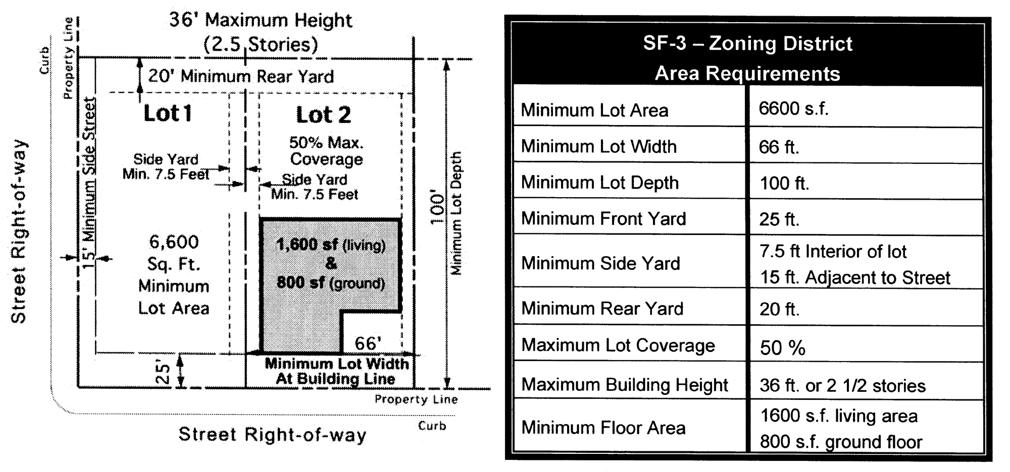 Area requirements. The requirements regulating the minimum lot size, minimum yard size (front, side, and rear), maximum building height (stories and feet), and maximum lot coverage, and minimum floor area, as it pertains to this district, shall conform with the provisions provided in the density, area, yard, height, and lot coverage requirements for the SF3 Zoning District.
