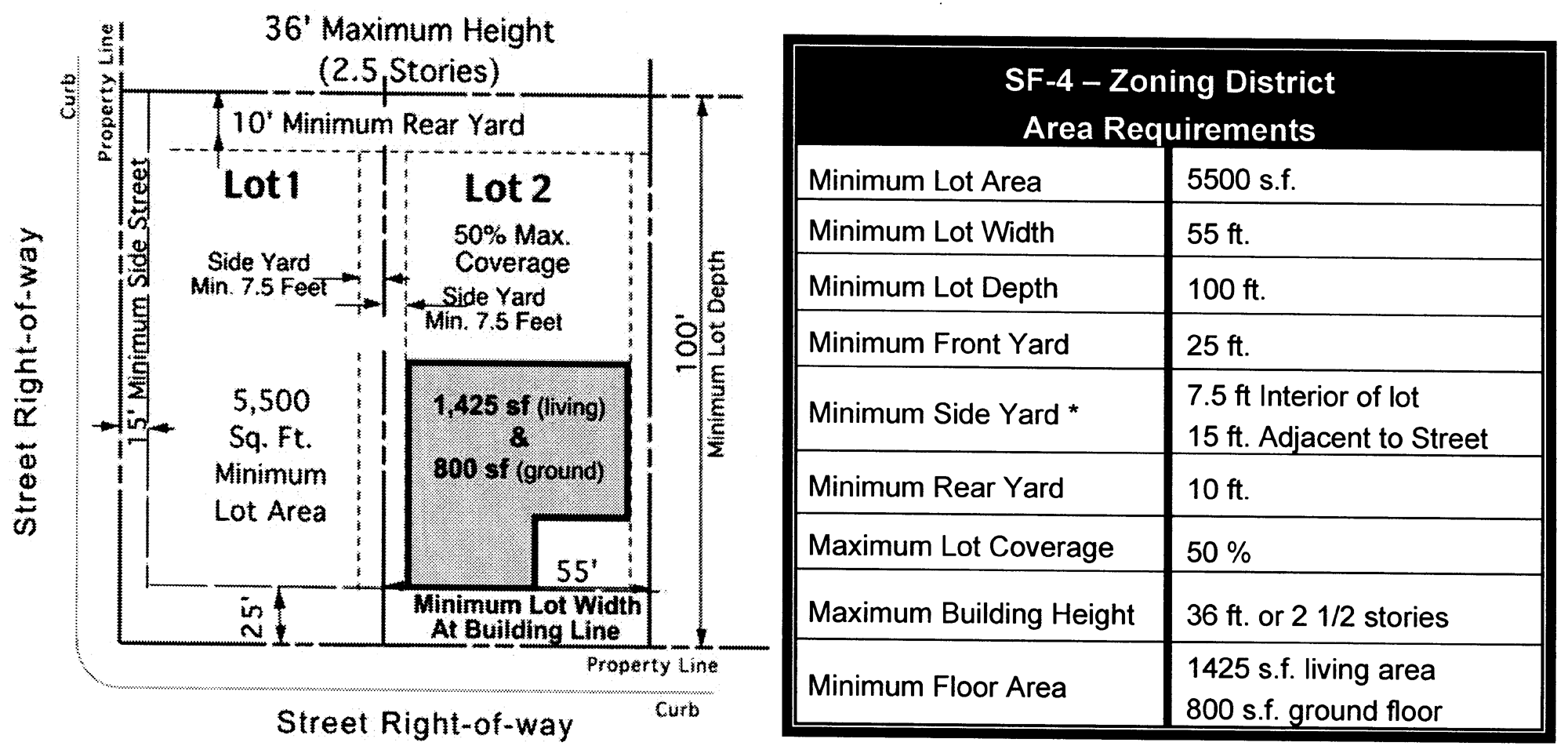 Area requirements. The area requirements regulating the minimum lot size, minimum yard size (front, side, and rear), maximum building height (stories and feet), and maximum lot coverage, and minimum floor area, as it pertains to this district, shall conform with the provisions provided in the density, area, yard, height, and lot coverage requirements for the SF4 Zoning District.