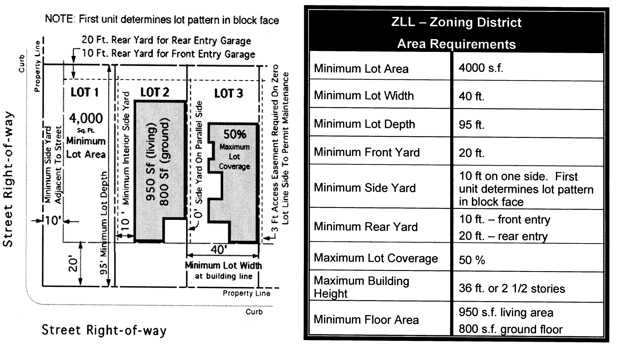 Area requirements The requirements regulating the minimum lot size, minimum yard size (front, side, and rear), maximum building height (stories and feet), and maximum lot coverage, and minimum floor area, as it pertains to this district, shall conform with the provisions provided in the density, area, yard, height, and lot coverage requirements for the ZLL Zoning District.