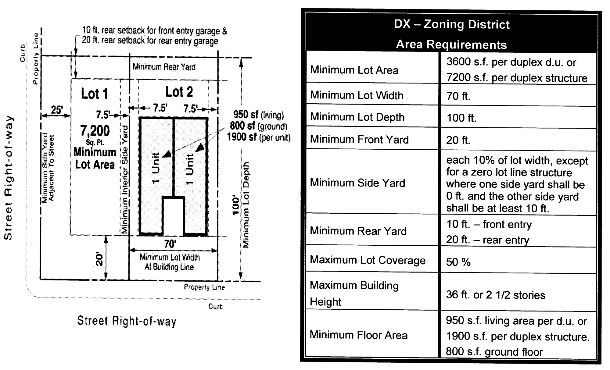 1 Note: When lots in the DX (Duplex) District are occupied by zero lot line structures, requirements for ZLL (Zero Lot Line) District shall apply and when lots are occupied by detached dwelling units, requirements for SF-4 District shall apply.