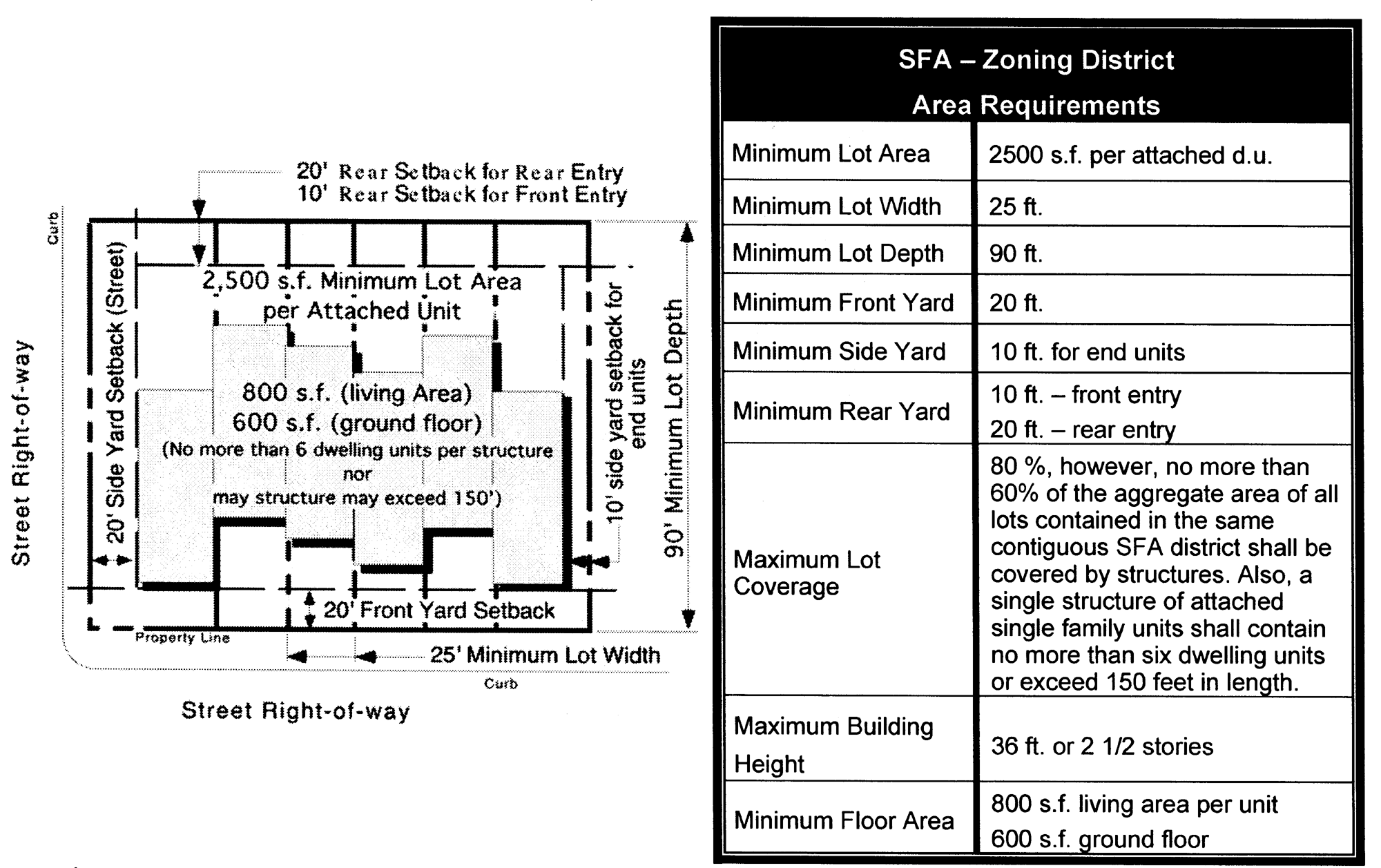 Area requirements.1 The requirements regulating the minimum lot size, minimum yard size (front, side, and rear), maximum building height (stories and feet), and maximum lot coverage, and minimum floor area, as it pertains to this district, shall conform with the provisions provided in the density, area, yard, height, and lot coverage requirements for the SFA Zoning District.