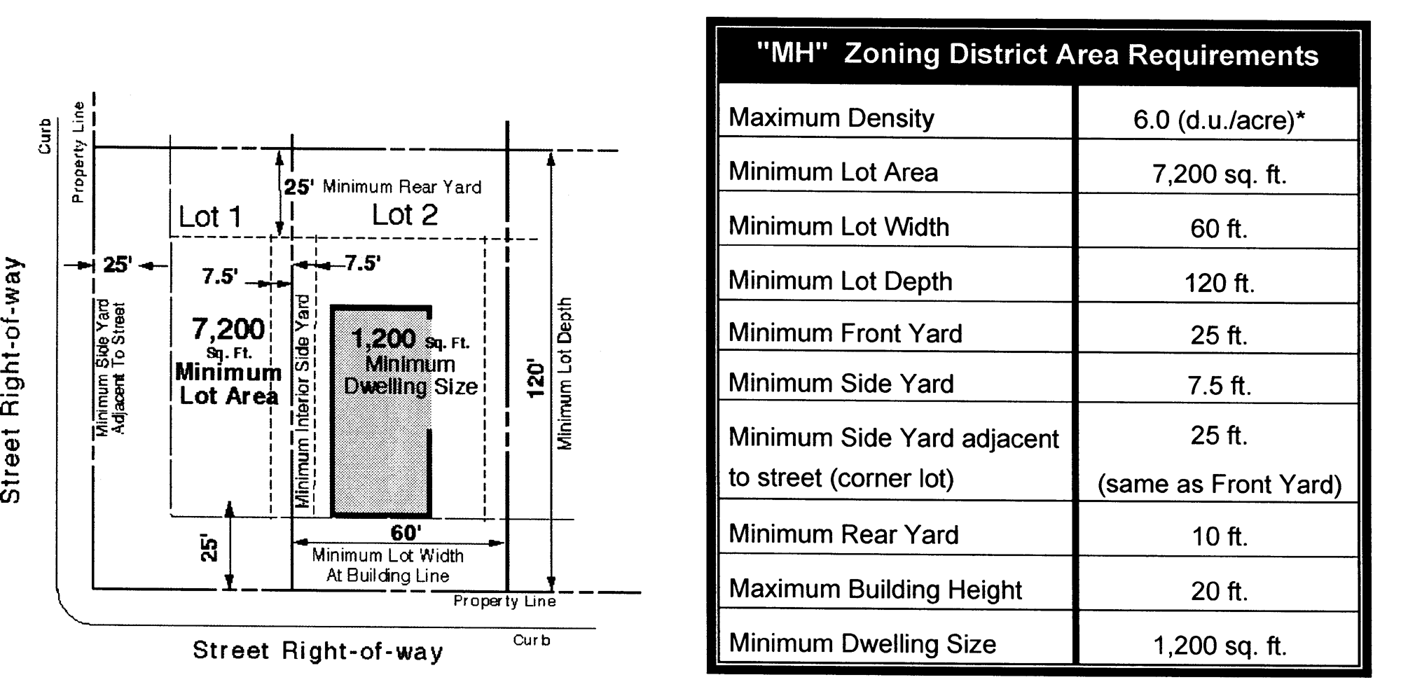 Area requirements. The requirements regulating the maximum permissible residential density, minimum lot size, minimum yard sizes, maximum building height, and maximum percent of lot coverage by buildings, as pertains to the "MH" district, shall conform with the provisions provided in the area requirements for the "MH" Zoning District table.