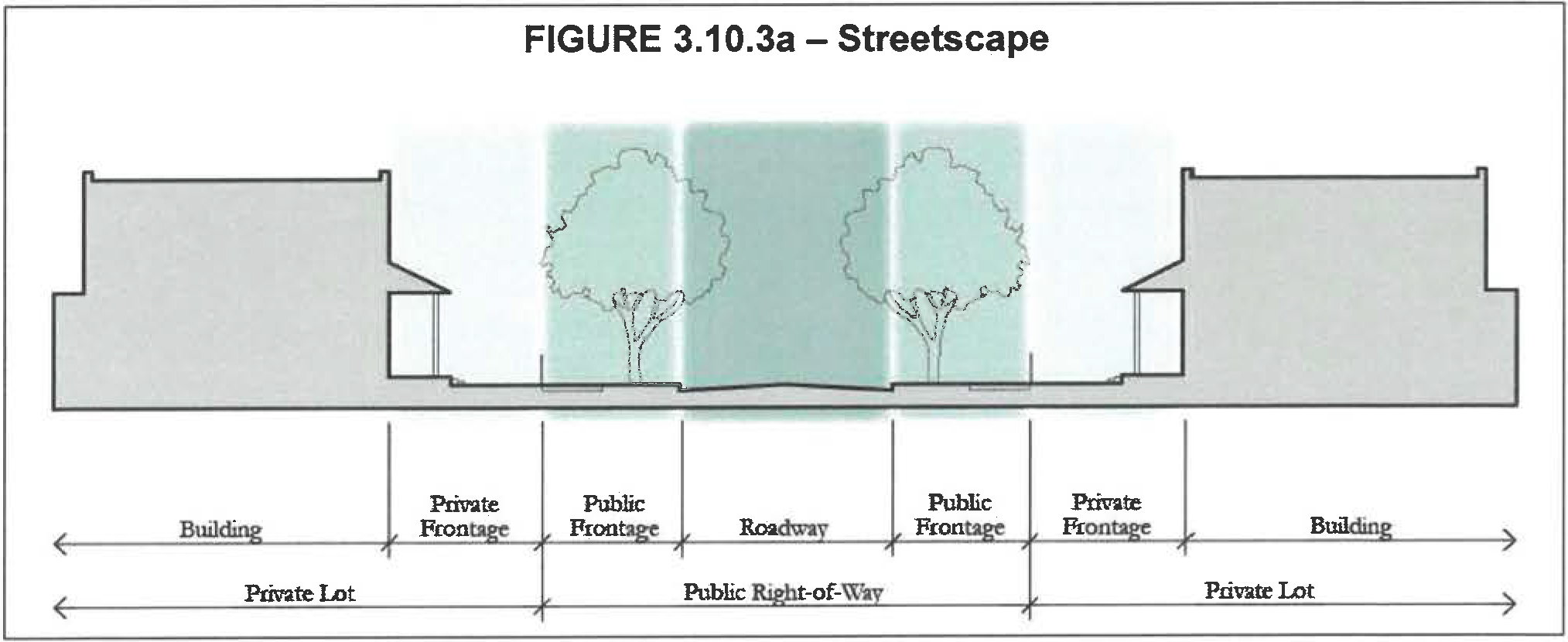 If a rear façade faces an adjacent right-of-way, street, or other public realm space, requiring two articulation elements, enhanced perimeter landscape is permissible as one of the two required articulation elements. The perimeter landscaped area shall be a minimum five feet wide and shall include groundcover and shrubs/vegetation that provide dense screening with a mature height of six feet at a minimum, and one understory tree or clusters of three palm trees for each 25 feet, or fraction thereof, of the linear building façade.