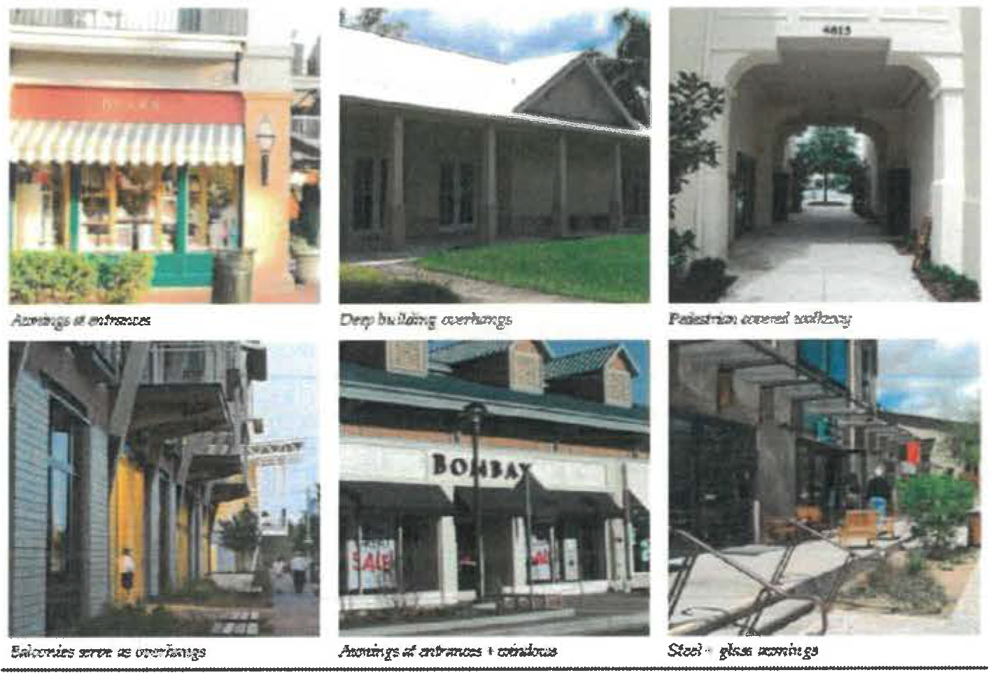 Overhangs or other roof treatments that provide shade and break the vertical plane, a minimum of three feet deep that cover at least 20 percent of the horizontal length of the façade.