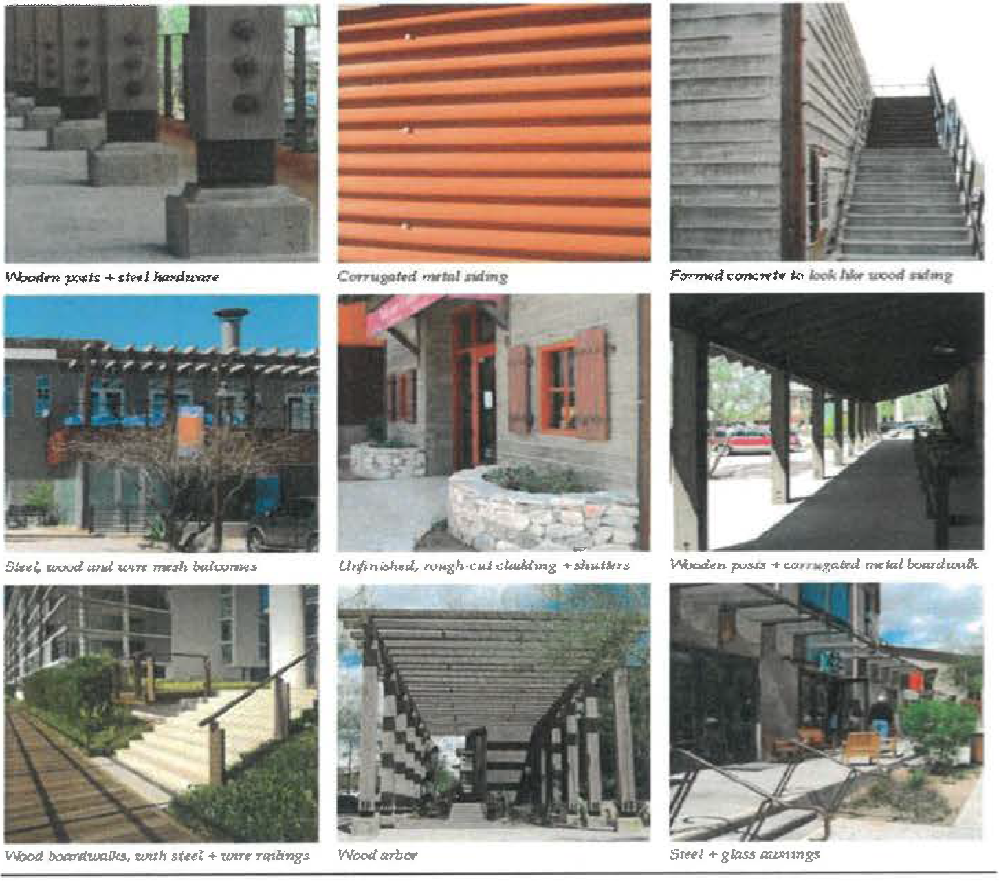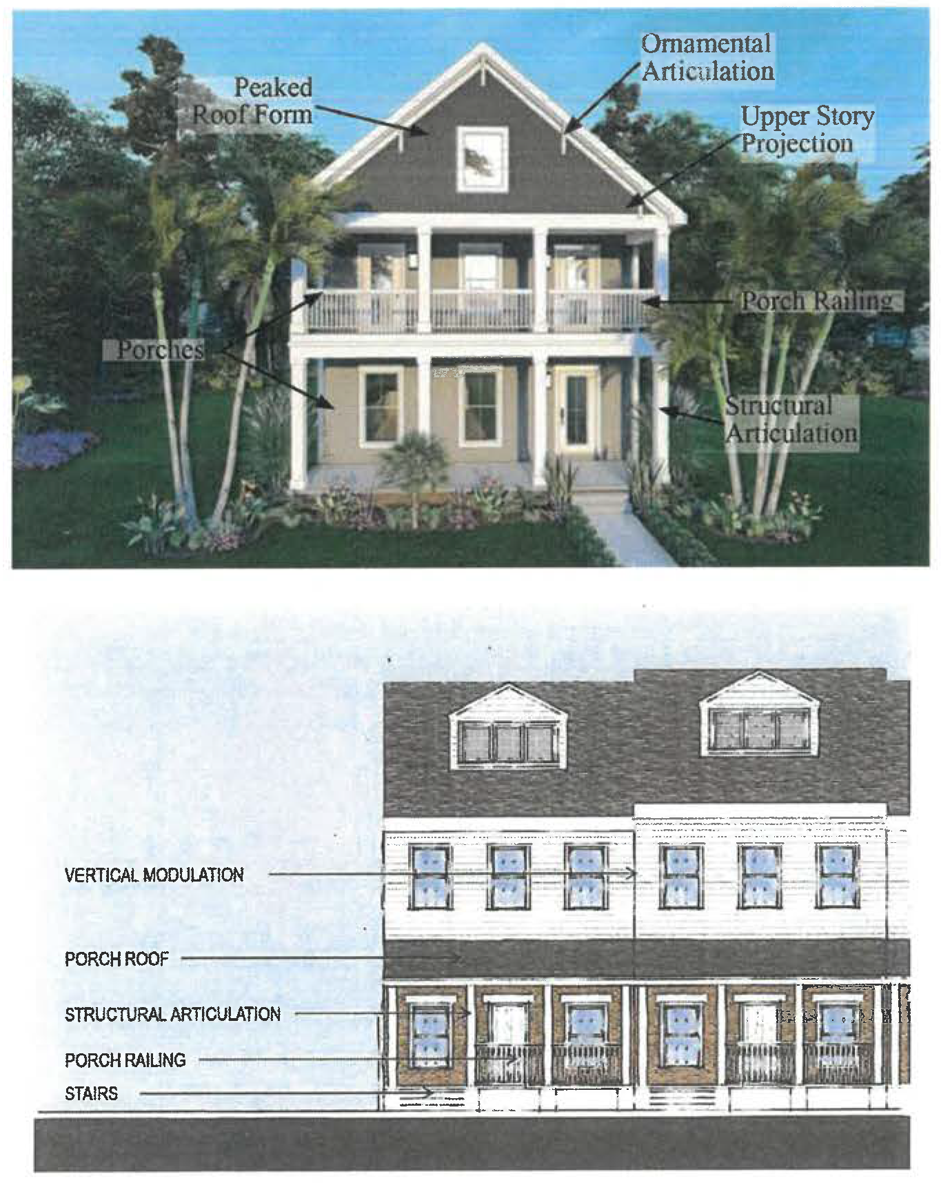 Canopies, balconies, patios, porches or porticos, bay windows, steps, ornamental guardrails, porch railing, pergolas, columns, all of which shall be integrated with the building's massing and style.