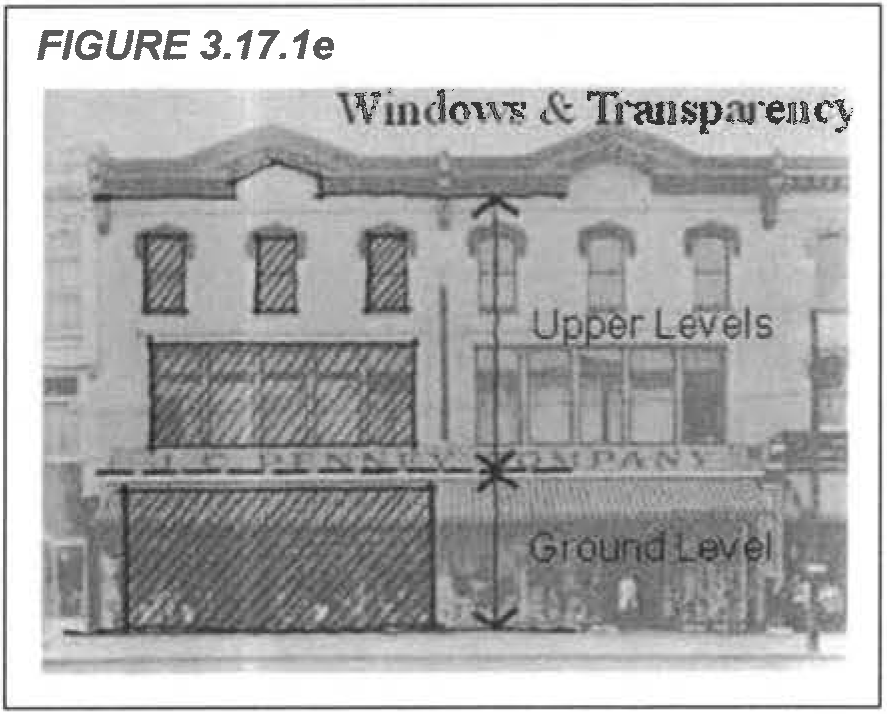Windows, doors and/or openings shall occupy a minimum of 15 percent of the area of the primary façade and ten percent of the area of the secondary façade or façades that front a street, park, plaza or on-site courtyard.