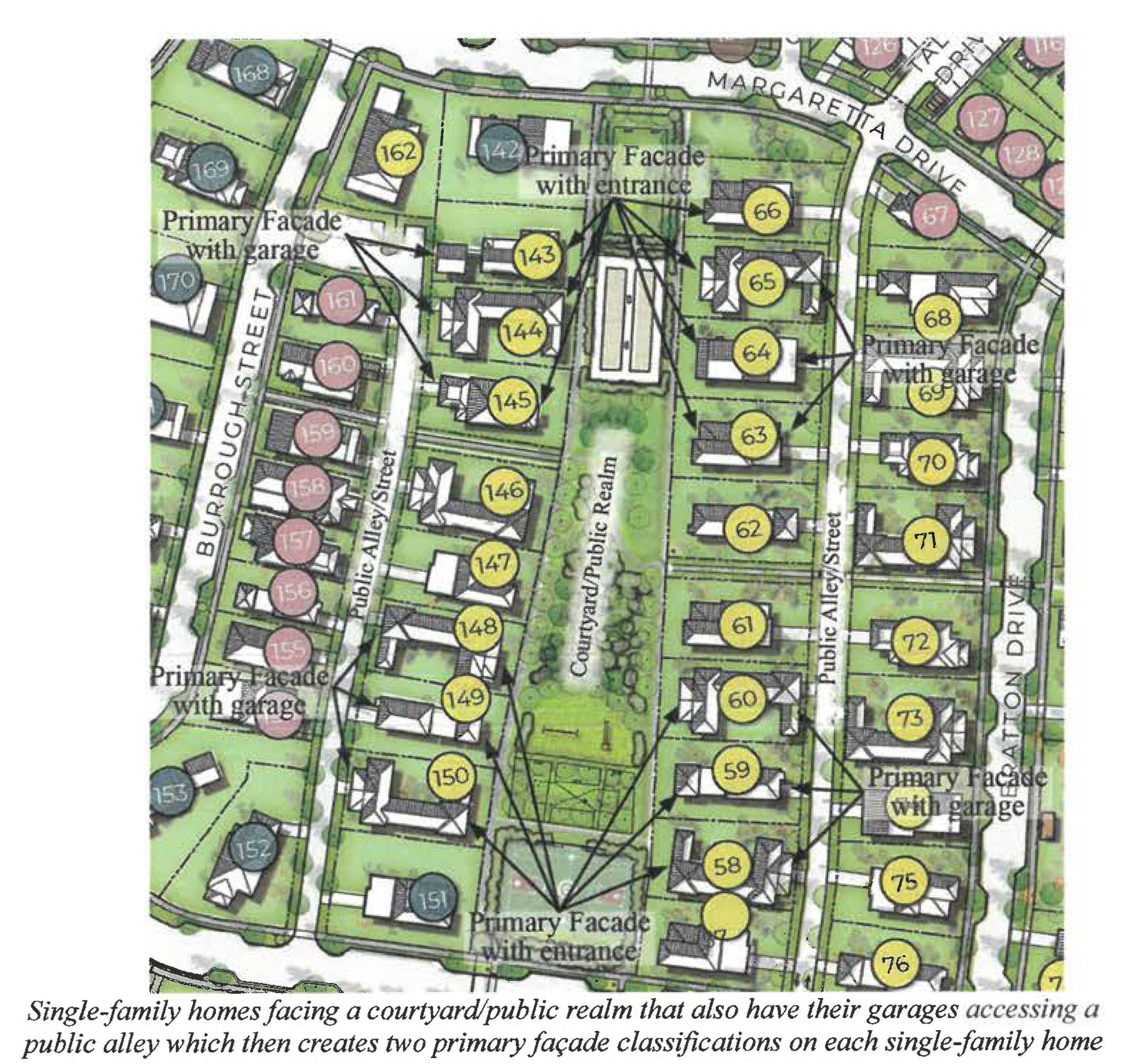 Rear façade facing an adjacent right-of-way, street, alley, or other public realm space: Two articulation elements.
