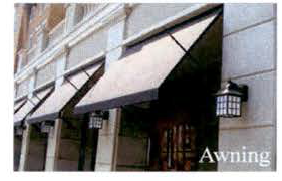 Awning. A structure made of metal or similar framing material, cloth or other material, and is attached to a building or carried by a frame supported by the building.