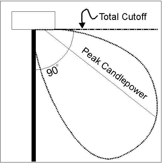 Cutoff: The point at which all light rays emitted by a lamp, light source or luminaire are completely eliminated at a specific angle above the ground.