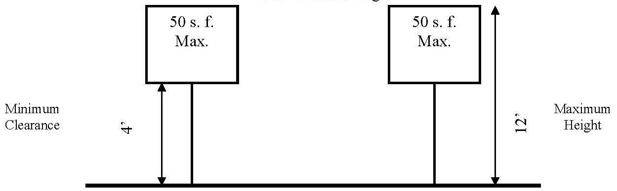 Pole-mounted sign. A pole-mounted sign shall not be greater than 12 feet in height with a sign face area of not more than 50 square feet and a minimum four-foot clear area between the ground and the bottom edge of the sign. The sign may be constructed or erected on one or more poles (Figure A).