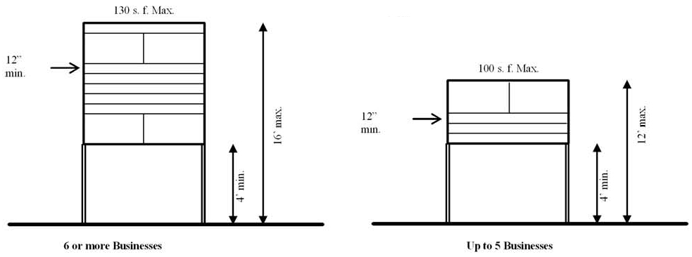 The maximum sign area and height for a sign along the front yard is limited as depicted in Figure C and shall contain not more than two sign faces. The maximum sign area and height along the street side yard shall be 50 percent of that permitted in the front yard. The sign may be constructed or erected on one or more poles. Business directories are inclusive of the total permitted sign area, not in addition to it. Individual business directory signs should be a minimum of 12 inches in height.