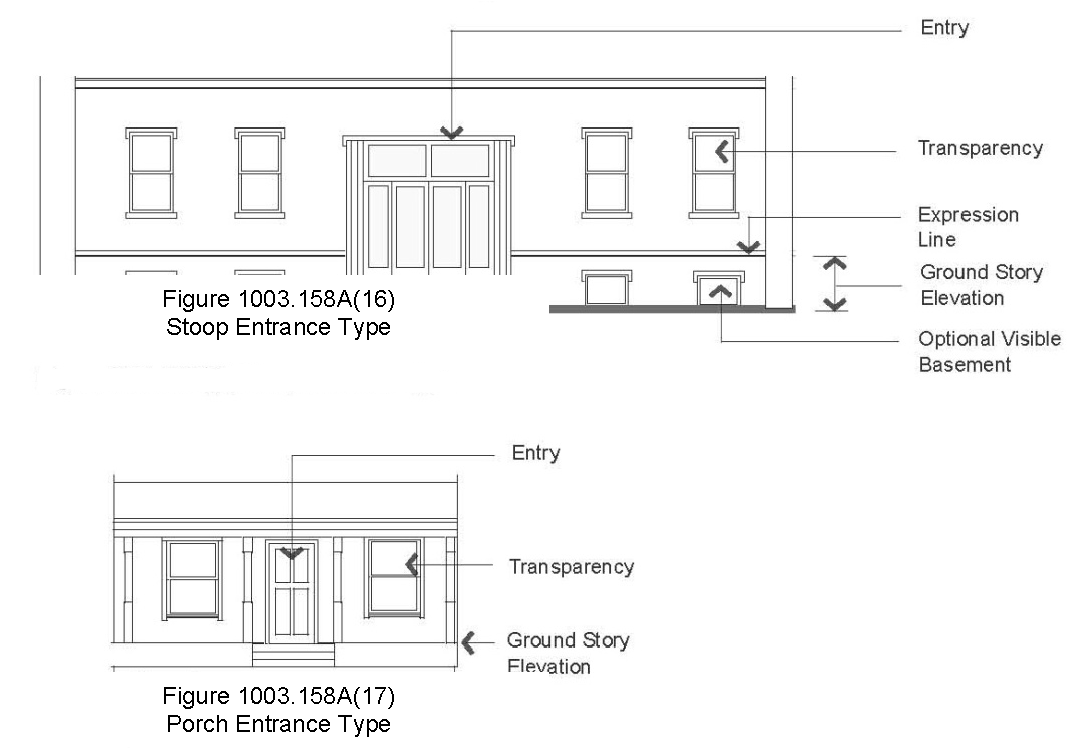 Entrance types. Entrance type standards apply to the ground story and visible basement of front façades of all building types as defined in this section.