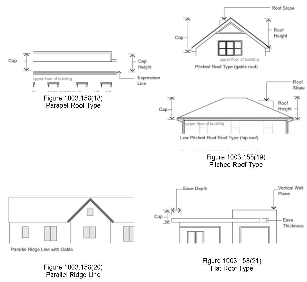 Parapet roof type. Refer to figure 1003.158(18), parapet roof type. A parapet is a low wall projecting above a building's roof along the perimeter of the building. It can be utilized with a flat or low pitched roof and also serves to limit the view of roof-top mechanical systems from the street.