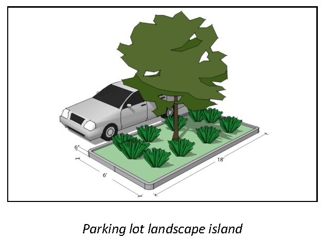 Landscape islands of not less than eight (8) feet by eighteen (18) feet at the terminus of each row of parking that contain one (1) tree and at least fifty (50) percent vegetative cover other than turf grass (see figure to right);