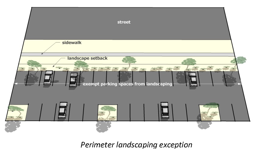 Parking spaces directly abutting a public street right-of-way are not required to have interior landscaping where the abutting landscaping meets the requirements of the perimeter landscape setback (see figure following this subsection). The remainder of the parking rows in the lot shall be landscaped pursuant to this section.