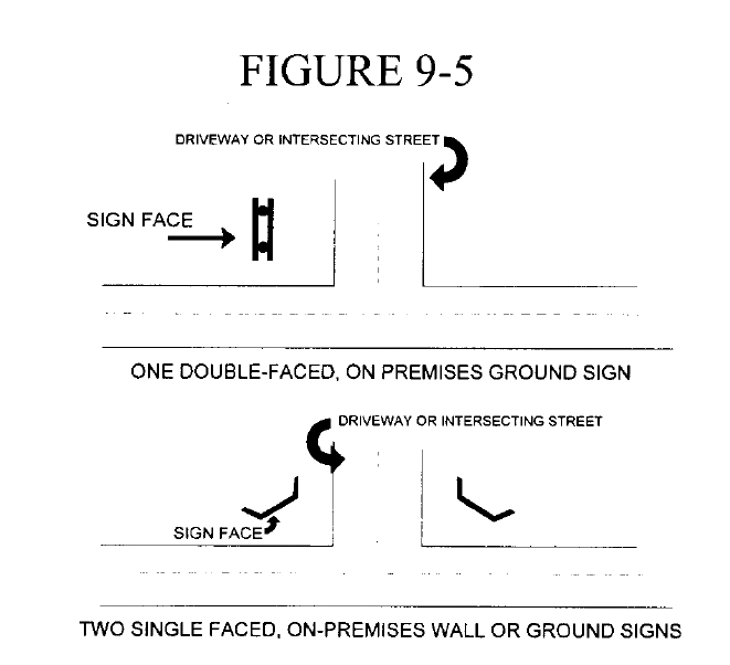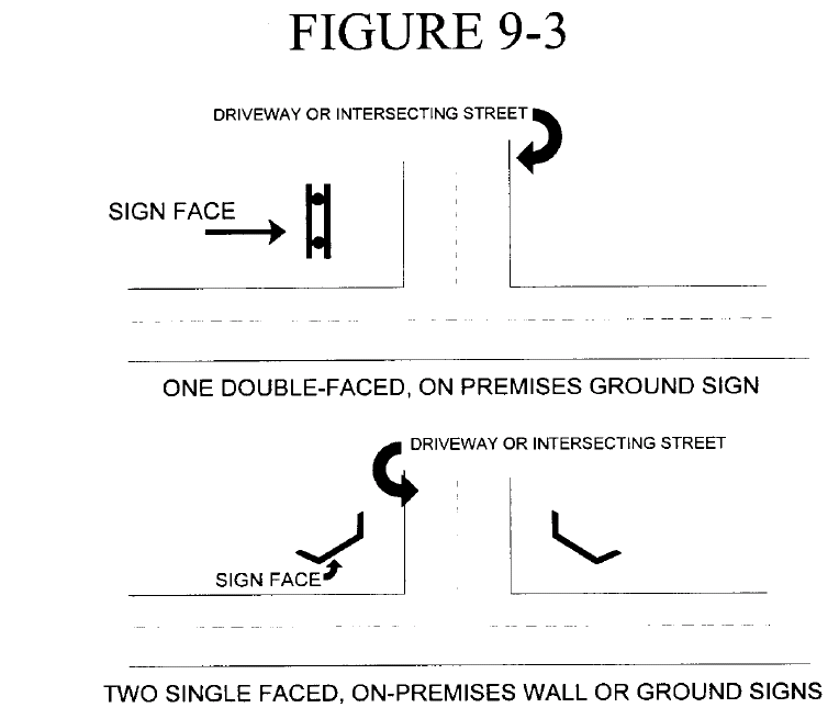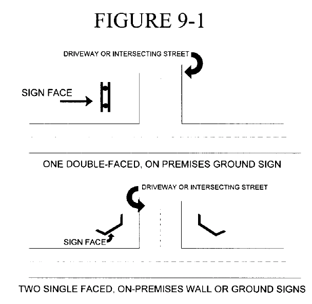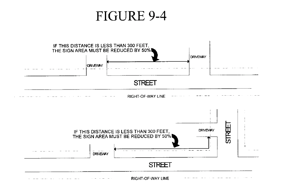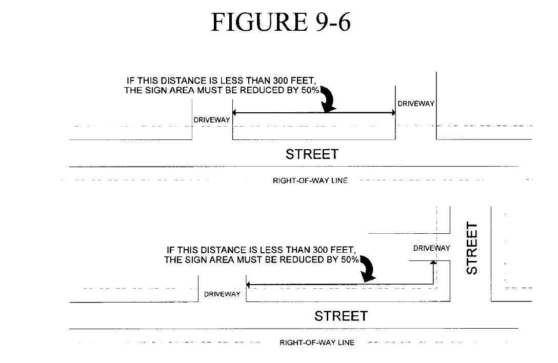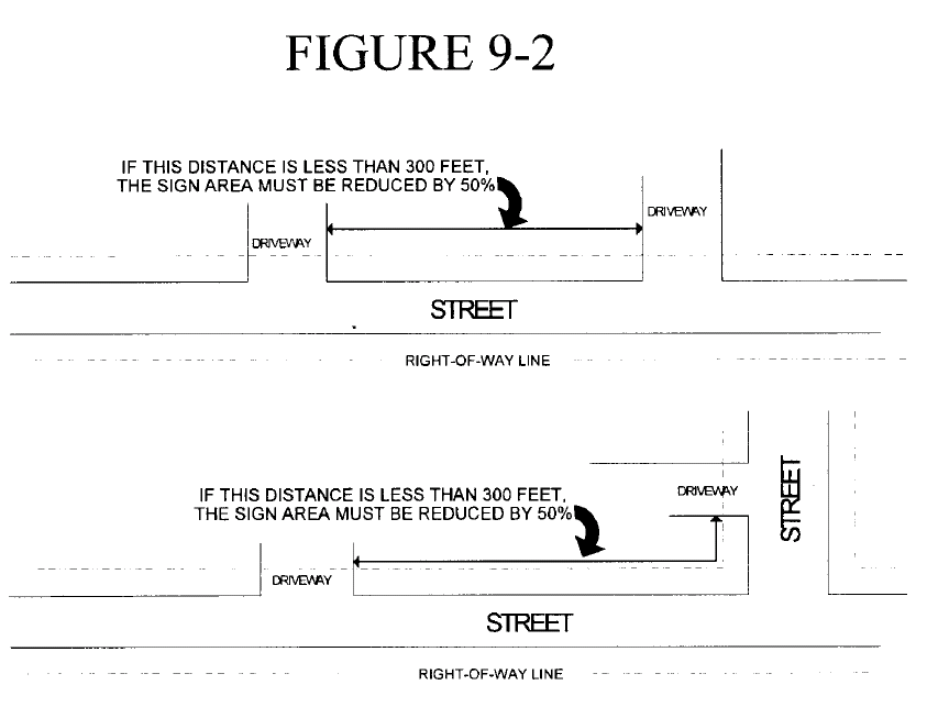 Where the distance between the nearest edges of separate entrances to the same residential development, farm, or ranch is less than three hundred (300) feet, as measured along the right-of-way of the abutting street, the maximum permitted sign area (indicated above) at such entrances shall be reduced by fifty percent (50%) (Figure 9.2).