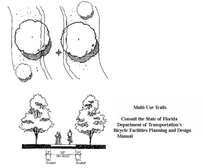 Bicycle/Pedestrian multi-user trails shall be designed in accordance with the following minimum required cross sections and FDOT standards. The Board of County Commissioners may authorize a modified roadway section as part of a Planned Development application, after receiving the recommendation of the Development Review Committee. Any proposed modifications shall consider the type and anticipated volume of vehicle, bicycle, and pedestrian movements as well as drainage and utility needs.