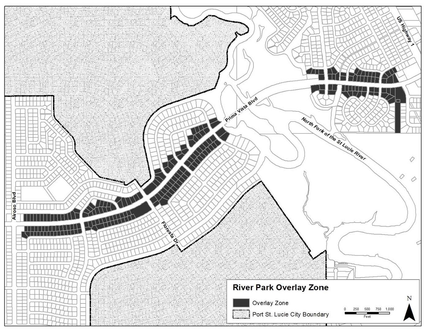 The River Park Community Overlay Zone shall consist of all those parcels of land lying in the following subdivisions as recorded in the official land records of St. Lucie County, Florida, and which share a common property line with the right-of-way for Prima Vista Boulevard and/or and are contiguous to a parcel of land that shares a common property line with the right-of-way for Prima Vista Boulevard: