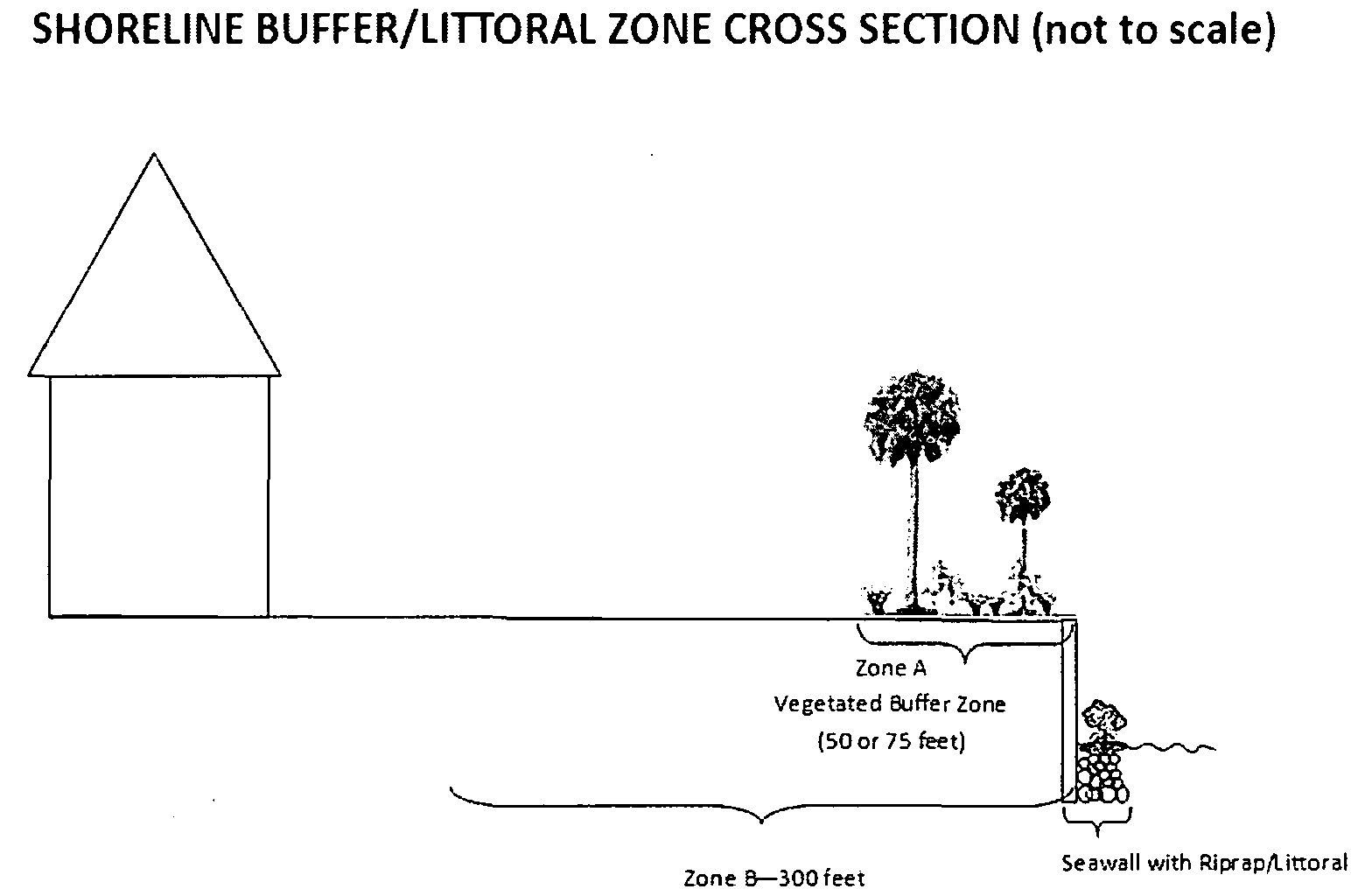 Include a topographic map of the proposed littoral zone showing the control elevation contour and the minus two and one-half-foot control water elevation contour, and include a cross-sectional view of the littoral zone planting design, showing the required slopes from the top of the bank to a depth of two and one-half (2½) feet below the control water elevation;