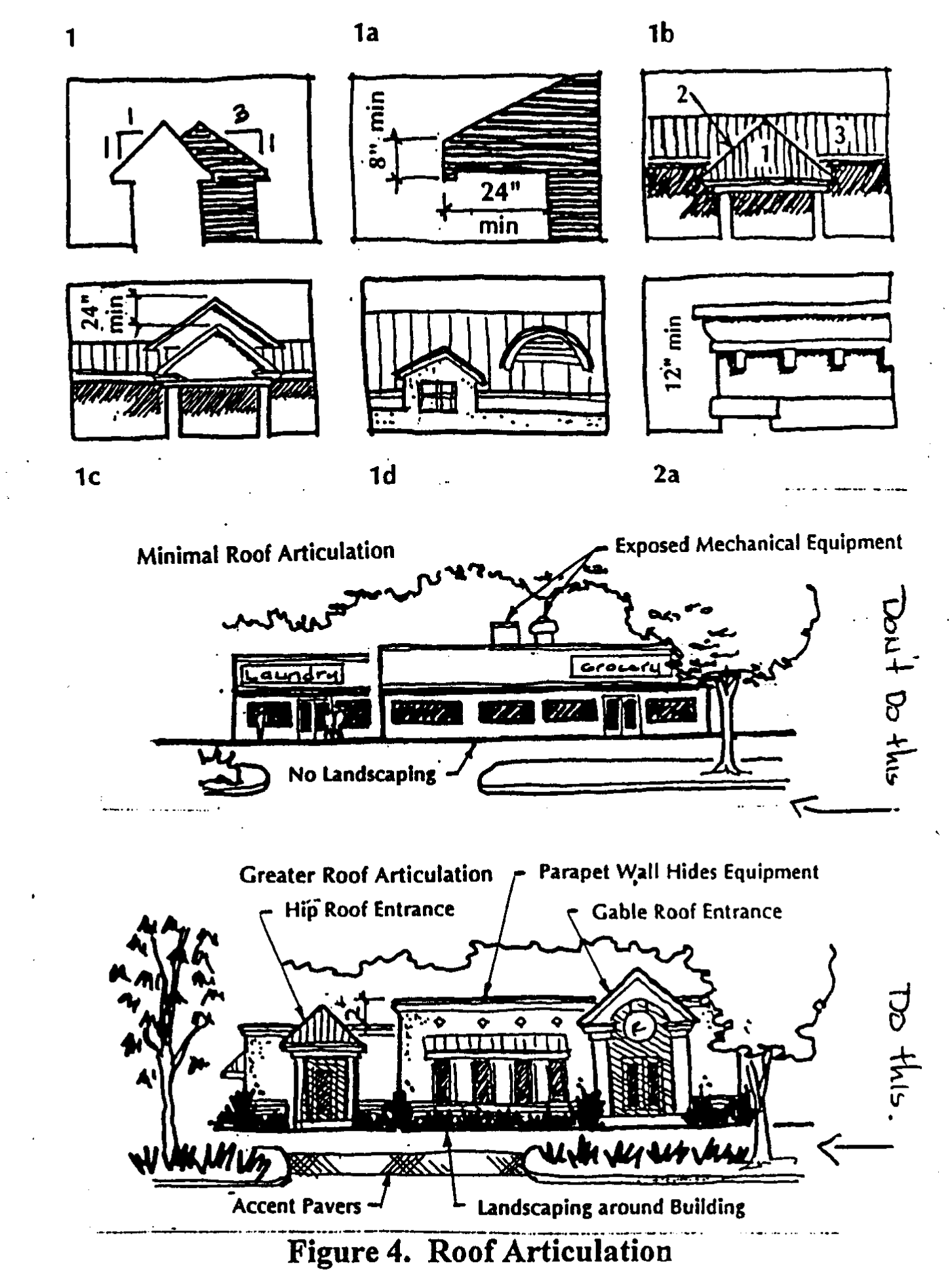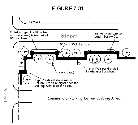 Off-street parking and loading areas shall be screened from adjacent roads and pedestrian walkways with hedges, dense planting, or changes in grades or walls.
