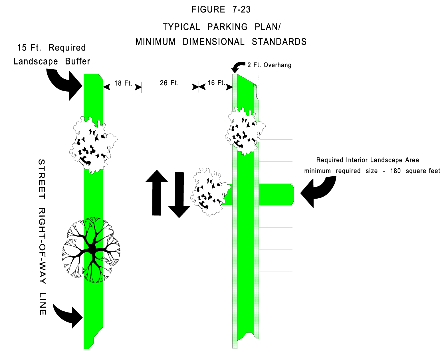 No more than fifteen (15) parking spaces shall be permitted in a continuous row without being interrupted by a minimum landscape area of three hundred sixty (360) square feet.