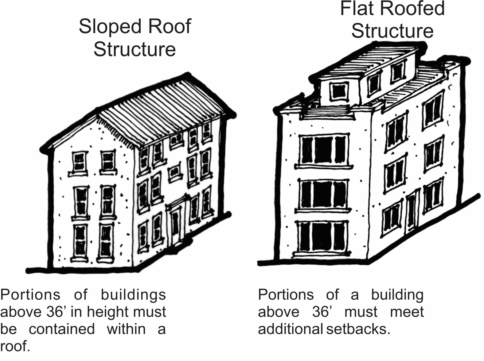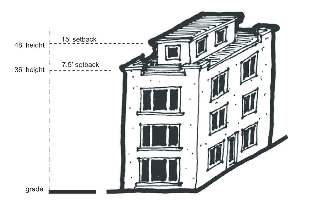Required building setbacks increase above 36 feet in height except for towers, turrets and dormers as provided herein. At 36 feet, or below, a cornice line shall be provided and the roofline shall begin. The roof slope shall not exceed 45 degrees (12:12 pitch). The roof peak shall not exceed the maximum height of 48 feet. If a sloped roof is not characteristic of the design style, the wall shall be accentuated with a cornice line at or below 36 feet in height. Any portion of a wall exceeding 36 feet in height shall be set back at least twice the normally required side yard setback from the side property line.