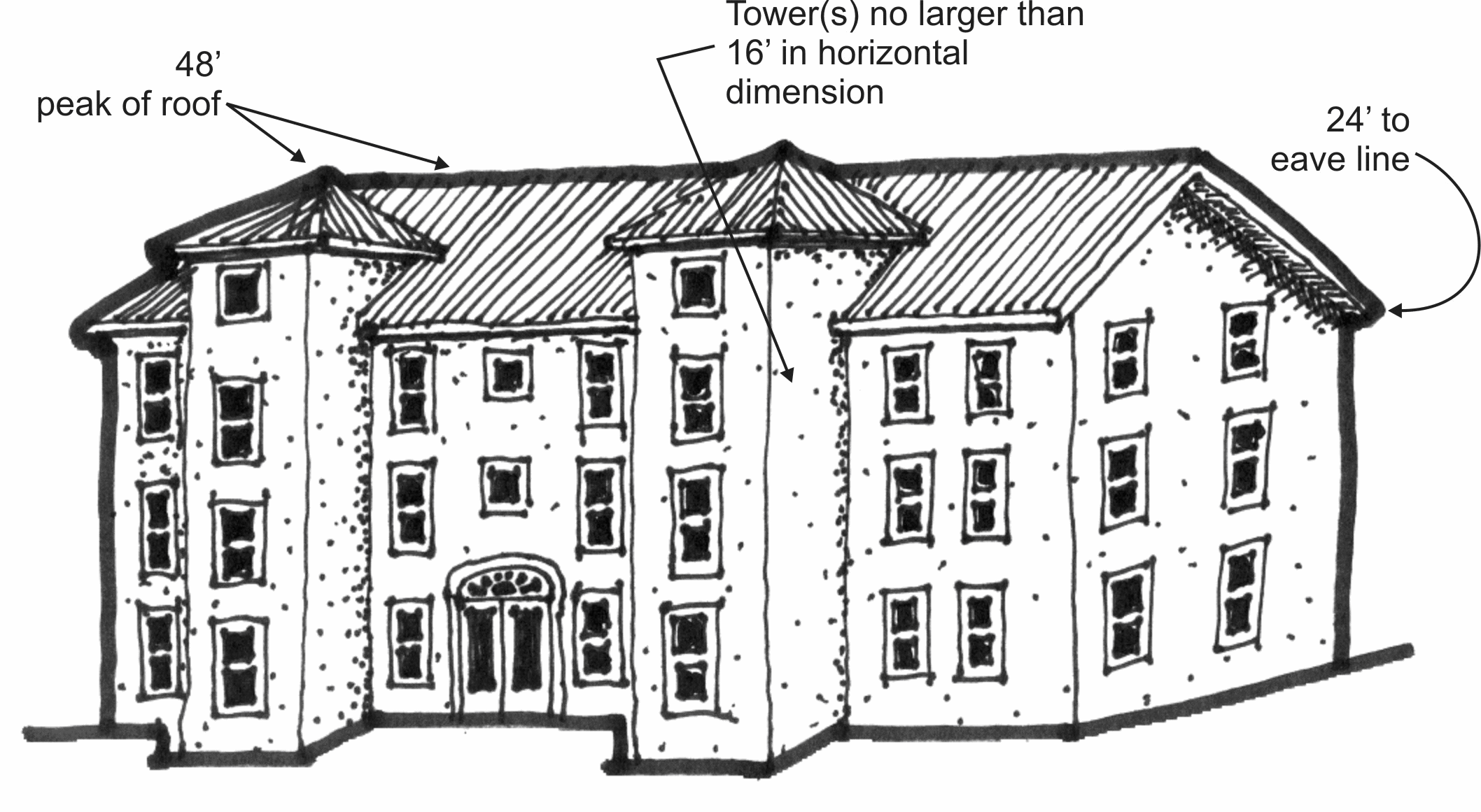 Many architectural styles feature towers and turrets. A tower or a turret may exceed the roof slope, provided no horizontal wall dimension exceeds 16 feet and for a tower or turret with a non-straight (rounded) wall, this dimension shall be calculated using the smallest rectangle which will enclose the wall.