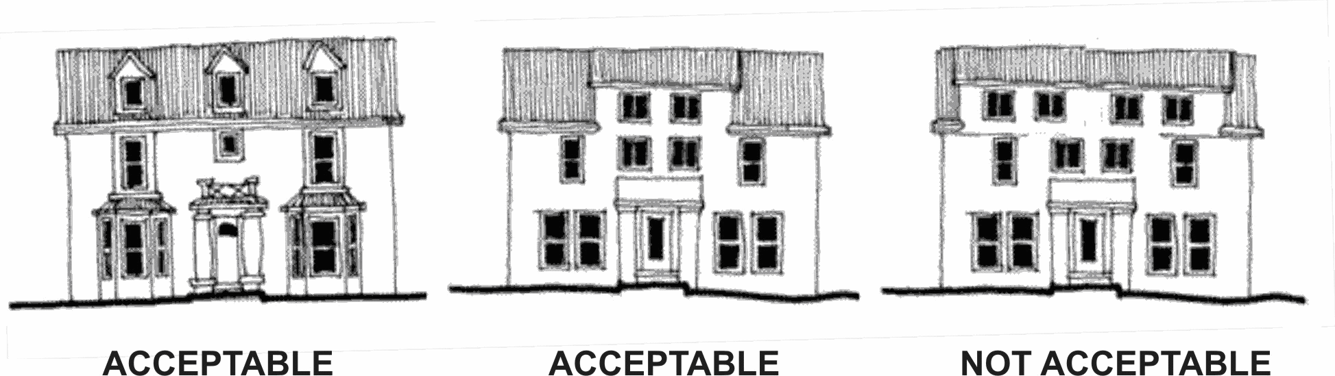 Many architectural styles feature dormers. A dormer may exceed the roof slope, provided the width of the dormer wall or the total width of the dormer walls, if more than one dormer, shall not exceed 50 percent of the roof width, or 16 feet of width, whichever is less. Dormers shall be compatible with the chosen architectural style.