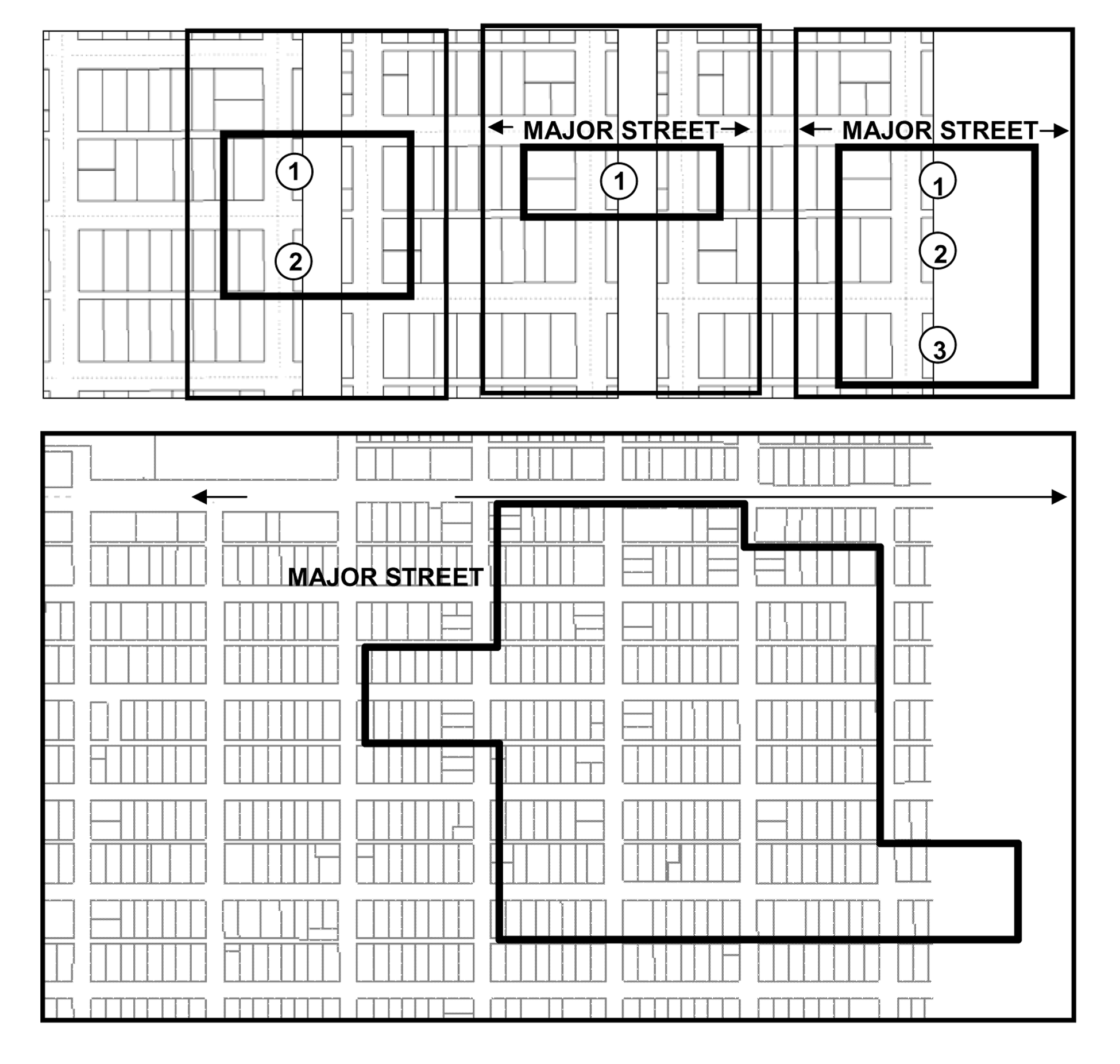 Minimum district size. The district boundary shall include a minimum of one roadway segment containing two opposing block faces; or, where the roadway segment is a major street as identified on Future Major Streets Map (currently Map 20) of the Comprehensive Plan, only one block face is required. Only full block faces may be part of an AEOD. The following graphics provide examples of permissible AEOD boundaries: