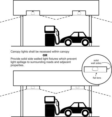 Luminaires. Lighting fixtures shall be full cut-off lighting fixtures or recessed into the canopy so that the bottom of each lighting fixture is flush with the ceiling of the canopy.