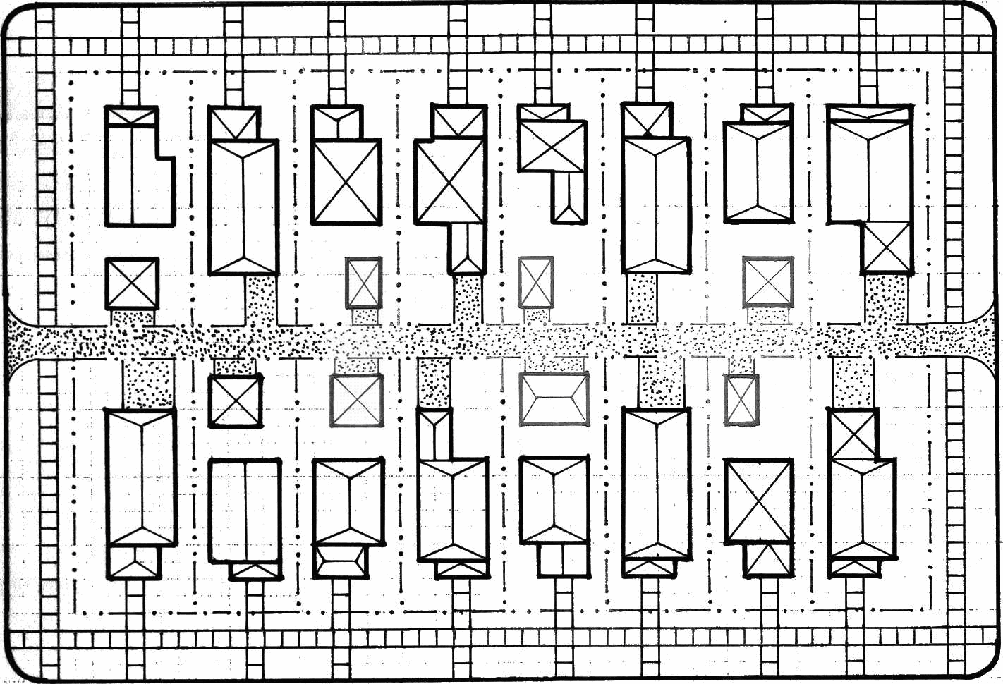 Narrow rectangular lots facing the avenue.