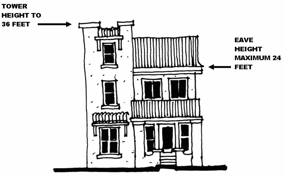 Many architectural styles feature towers and turrets. A tower or a turret may exceed the roof slope, provided no horizontal wall dimension exceeds 16 feet and for a tower or turret with a non-straight (or rounded) wall, this dimension shall be calculated using the smallest rectangle which will enclose the wall.