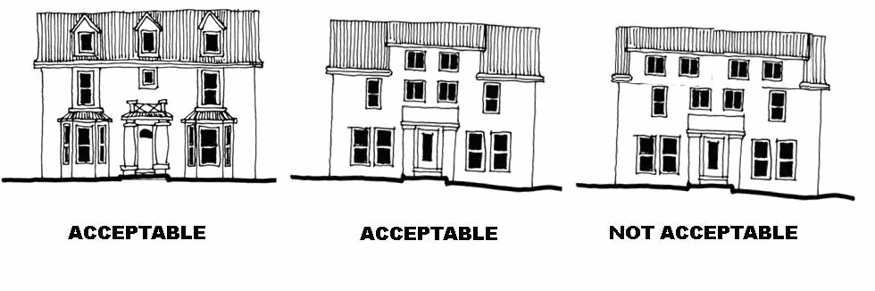 The front façade of a building shall create a width-to-height ratio of no more than 1:1. Buildings that exceed the width-to-height ratio of 1:1 shall feature architectural fenestration creating a bay system that divides the building design into a maximum ratio of 1:1. This may be done through pilasters, arcades, building line and roof line off-sets, materials and other appropriate architectural features.