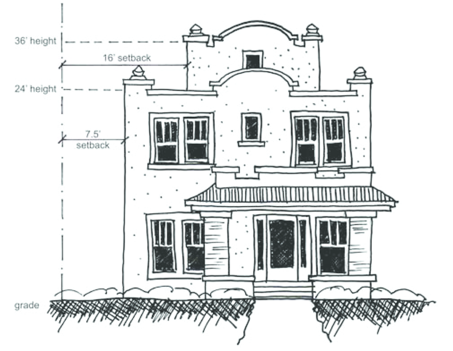 Building setbacks are based on the overall height of the various sections of a proposed building. As the building height increases, so does the minimum required setback.