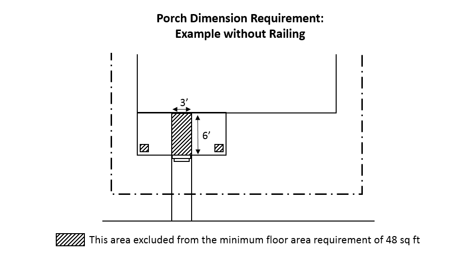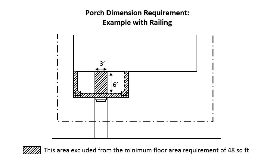 Principal entries shall include a porch, portico or stoop, with a minimum usable depth of six feet (measured from the front façade of the structure to the interior side of the railing or, if there is no railing, the furthest edge of the floor) and 48 square feet of total floor area, excluding a three-foot wide walkway to the primary entrance and the floor area of any column. Where a railing exists, only the floor area within the interior side of the railing shall count towards the minimum floor area. The POD may approve a reduction in the minimum size requirement or other entry alternatives such as a stoop or portico if consistent with certain architectural styles.