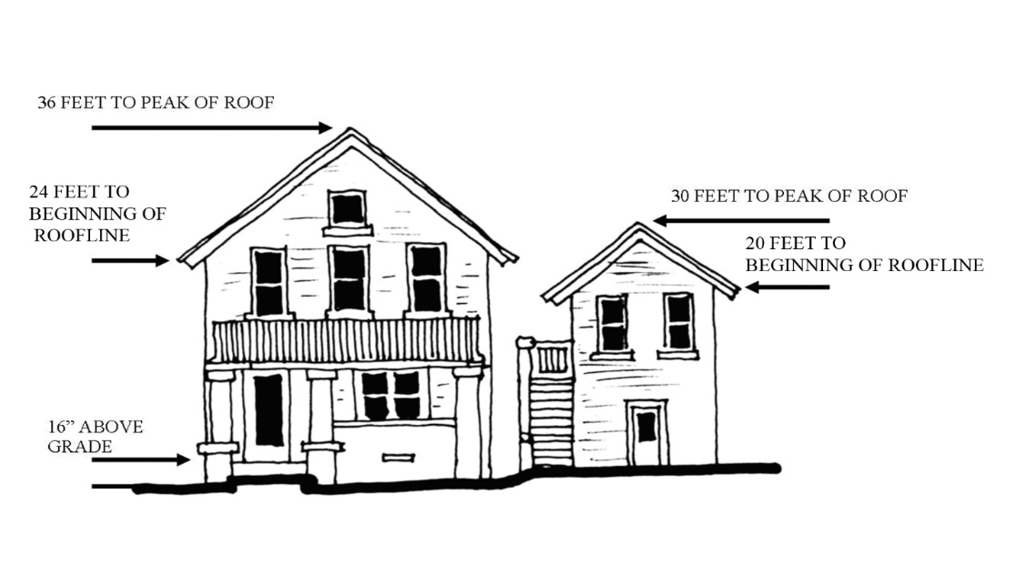 b. Elevate front porch an additional six-inches totaling a minimum of 18-inches above existing grade with a maximum building height to beginning of roof line of 22-feet and maximum building height to top of roof peak of 30-feet: 0.03 bonus.