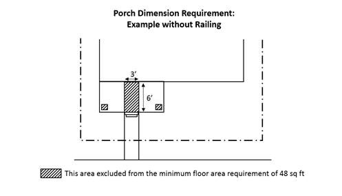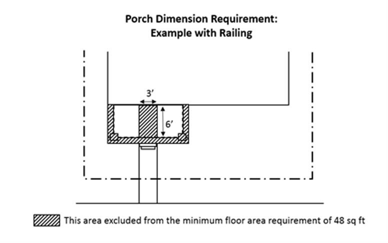 Principal entries shall include a porch, with a minimum usable depth of 6-feet (measured from the front façade line of the structure to the interior side of the railing or, if there is no railing, the furthest edge of the floor) and 48 square feet of total floor area, excluding a three-foot wide walkway to the primary entrance and the floor area of any column. Where a railing exists, only the floor area within the interior side of the railing shall count towards the minimum floor area. The POD may approve a reduction in the minimum size requirement or other entry alternatives such as a stoop or portico if consistent with certain architectural styles.