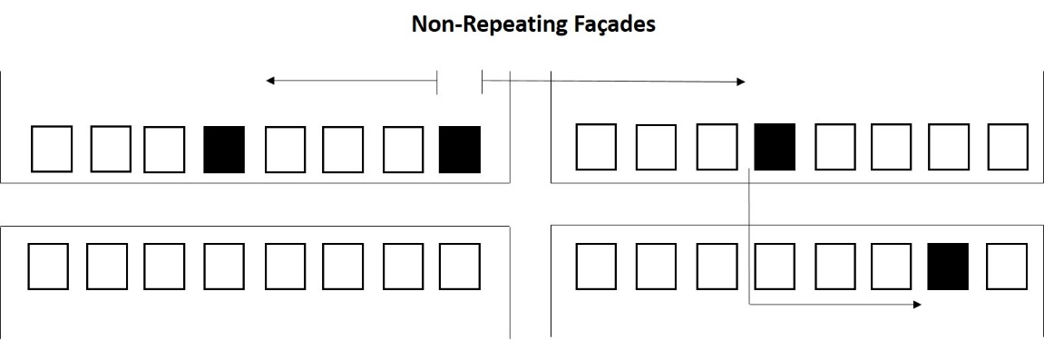 Design of buildings within the same block face on either side of the street or within an adjacent block face on either side of the street shall be varied, such that a substantially similar design will not be replicated. Bungalow courts are exempt from this non-repeat standard. Other creative layouts involving multiple buildings on a single parcel may be approved at the discretion of the POD.