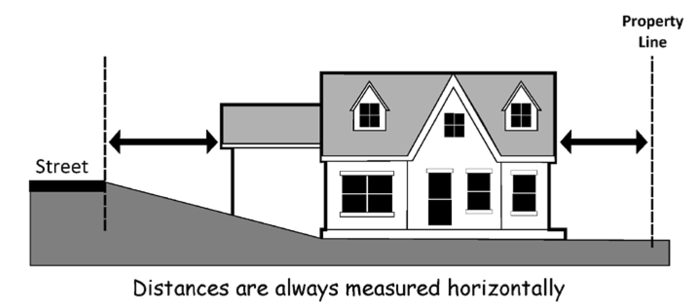 Generally. Setbacks are measured along a line that is perpendicular to the property line and extended from the property line inward toward the center of the lot. If the property line is curved, the setback shall be measured along a line that is a radius to the curve and extended from the lot line inward to the center of the lot.