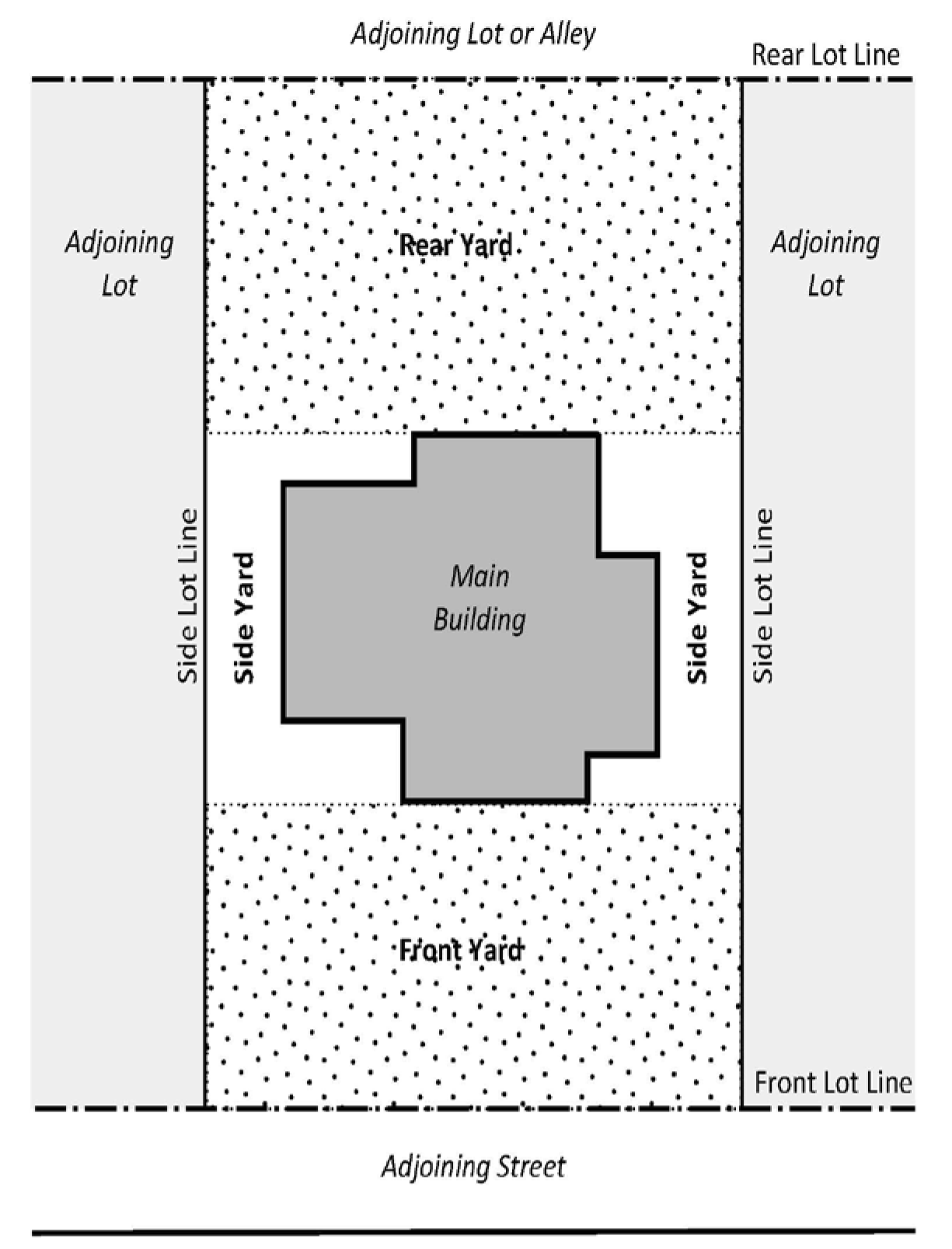 Rear yard. The rear yard is the area located between the main building and the rear lot line, and extending across the full width of the lot (see Figure 112-10). Unless otherwise provided under the UDC, rear yard depth is the horizontal distance between the rear lot line and the point on the foundation of the main building that is nearest to the rear lot line.