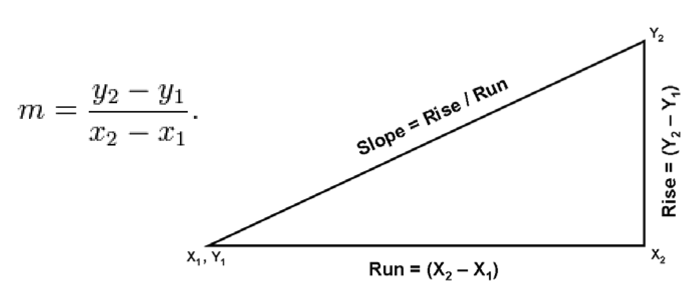 Calculating slope. Slope is calculated as the ratio of the altitude change ("rise") to the horizontal distance ("run") between two points on a line. Given two points (x1,y1) and (x2,y2) on a line, the slope (m) of the line is calculated as shown in Figure 112-8.