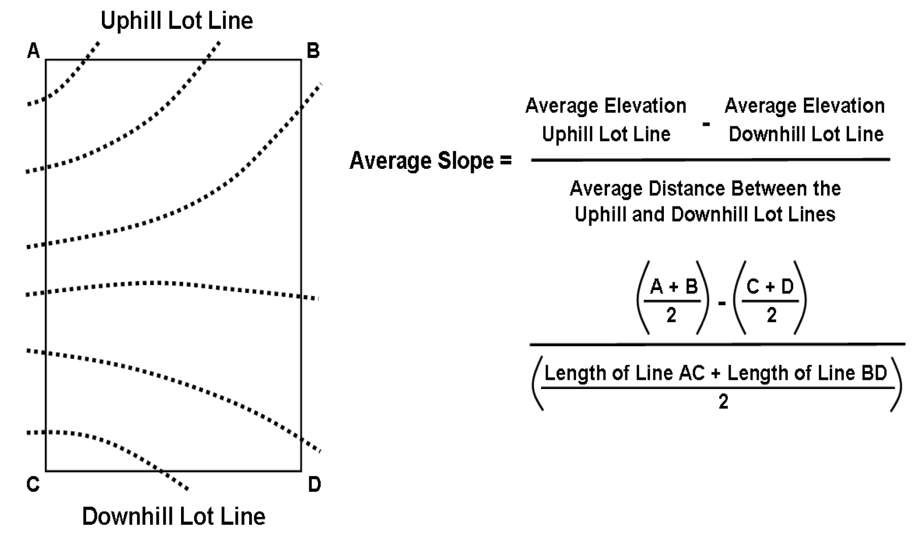 Calculating average cross slope. Average cross slope is calculated by dividing the average change in elevation between the uphill lot line and the downhill lot line by the average distance between the uphill lot line and the downhill lot line (see Figure 112-9).