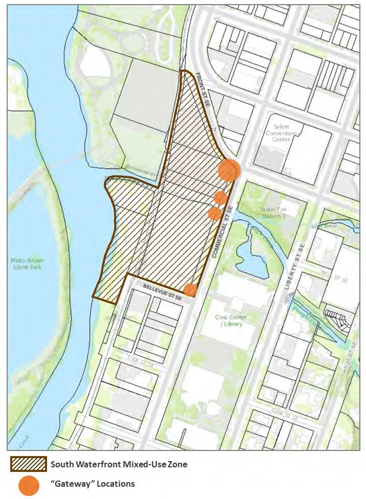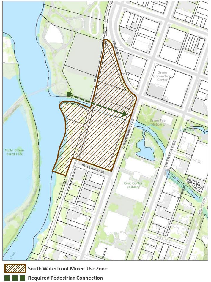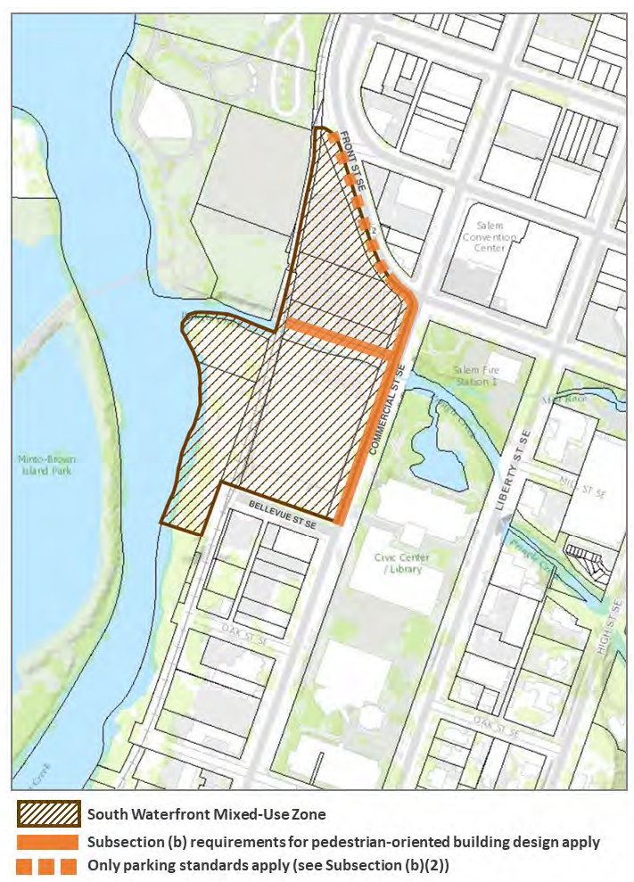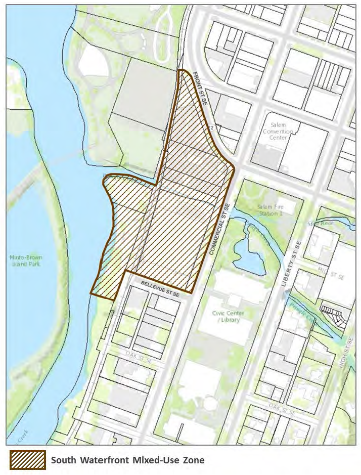 The purpose of the South Waterfront Mixed-Use (SWMU) Zone is to implement the river-oriented mixed-use designation of the Salem Area Comprehensive Plan through the identification of allowed uses and the establishment of development standards to further economic development and support the creation of a vibrant downtown. The SWMU provides for a mixture of uses developed in a manner that promotes an active and inviting pedestrian environment, and that takes advantage of close proximity to Pringle Creek, Riverfront Park, the Willamette River, and the downtown.